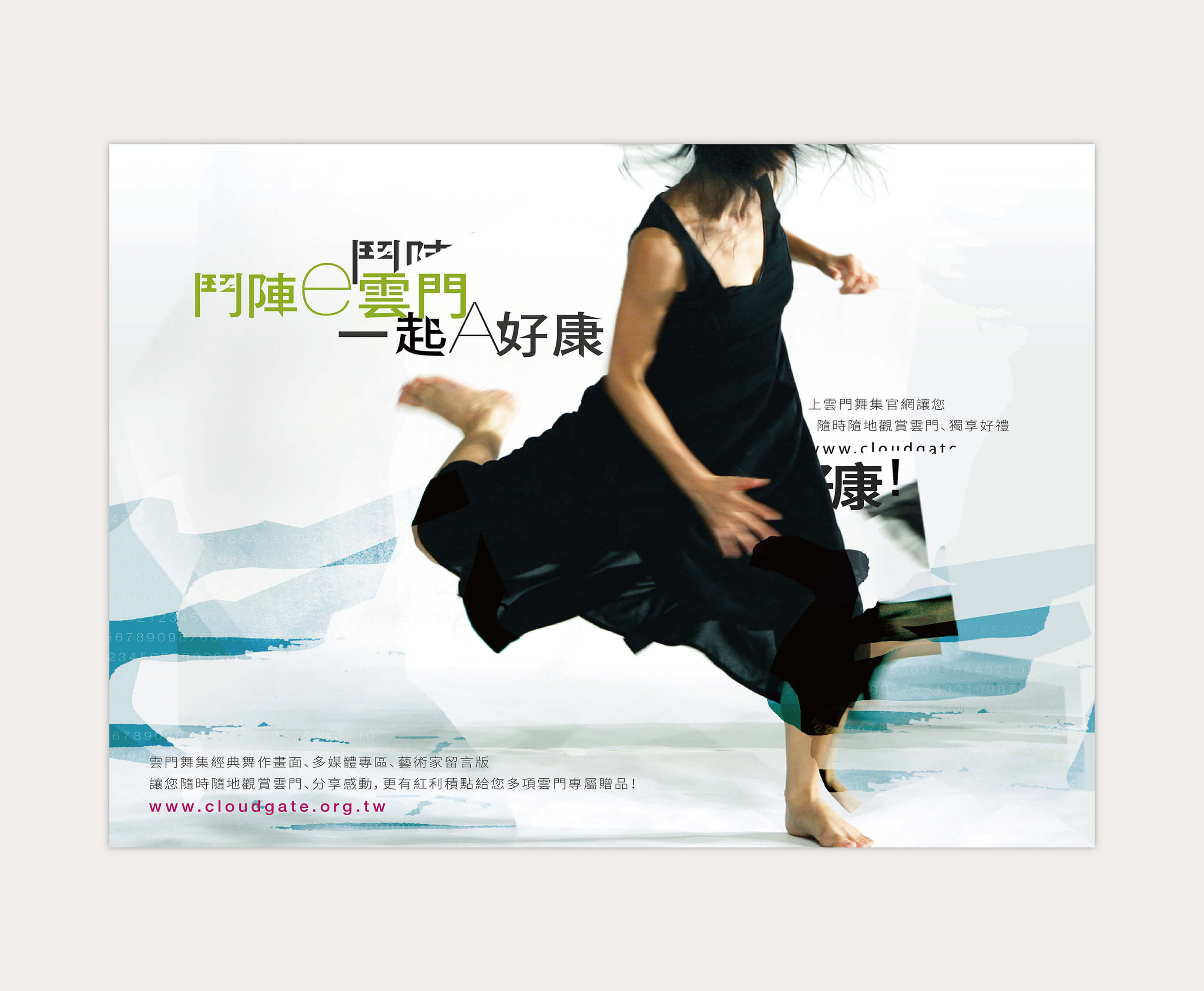 雲門舞集 此作品則是針對網站活動所執行的設計,在舞者的周圍運用碎片式的拼貼手法,象徵網路世界 的片斷式資訊,整體視覺也是以較為藝術的手法來呈現。