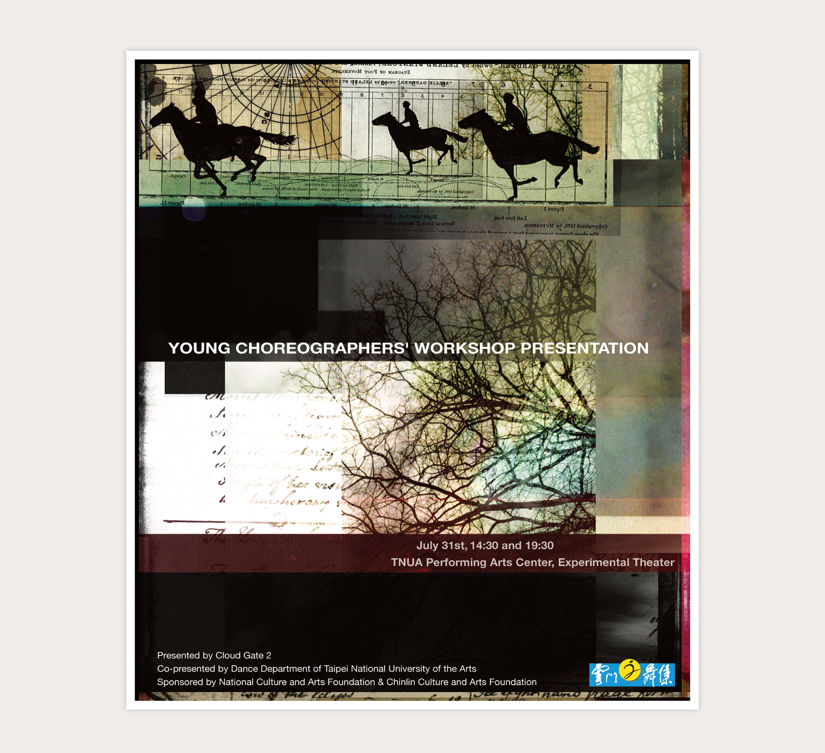 雲門舞集 此作品是雲門舞集針對年輕編舞者所舉辦的"尋找千里馬"活動,藉此找尋優秀編舞家並提供可揮灑 的舞台,在此作品裡使用手感效果呈現出較為藝術的視覺調性,另外以複雜的樹枝交錯同時帶有不同 的彩度背景,隱喻年輕人的未來充滿挑戰性,同時也有令人期待的繽紛色彩。