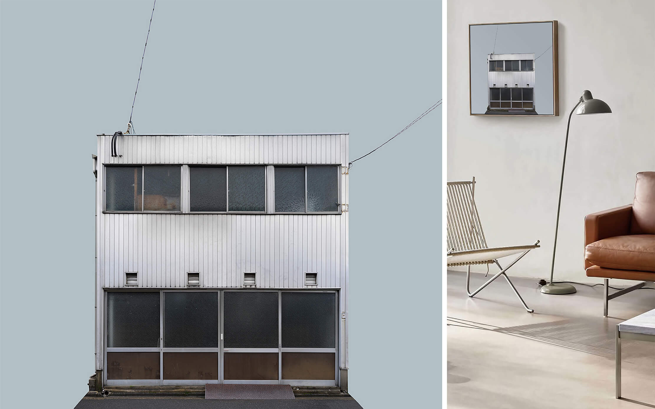 此作品攝於日本京都,透過後製以純色背景取代原有場景,使建築脫離環境脈絡,轉化為靜物般